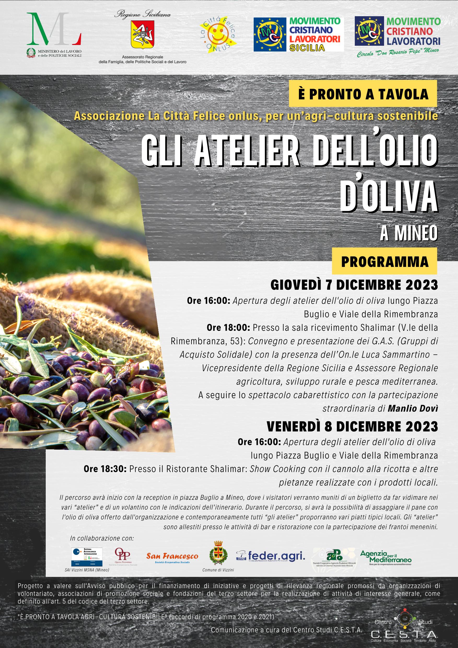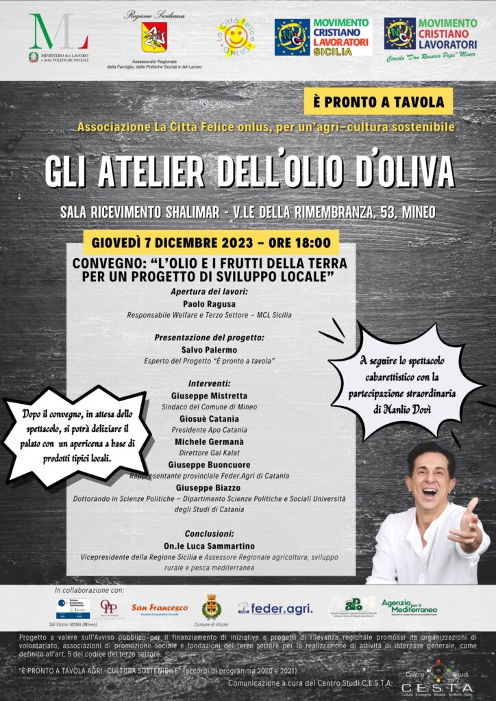 Nuovo evento di presentazione dei Gas e Show Cooking a Mineo (CT) per il Progetto “È PRONTO A TAVOLA”, promosso dall’associazione “La Città Felice” ONLUS e i partner MCL Sicilia ed MCL Mineo. L’ evento si aprirà giorno 7 dicembre con l’inaugurazione degli Atelier dell’olio di oliva, presso cui saranno offerti degli assaggi di olio locale, a seguire il Convegno “L’olio e i frutti della terra per un progetto di sviluppo locale” e la presentazione dei Gas, alla presenza dell’ On.le Luca Sammartino, Vicepresidente della Regione Sicilia e Assessore Regionale agricoltura, sviluppo rurale e pesca mediterranea. Si proseguirà giorno 8 dicembre con l’apertura degli Atelier dell’olio di oliva, seguita dallo Show cooking, durante il quale saranno realizzate pietanze con prodotti locali. Durante il percorso per gli Atelier dell’Olio di oliva, che verranno allestiti lungo Piazza Buglio e Viale della Rimembranza, il visitatore avrà la possibilità di assaggiare il pane con l’olio di oliva offerto dall’organizzazione e contemporaneamente tutti “gli atelier” proporranno vari piatti tipici locali. Di seguito il programma nel dettaglio: